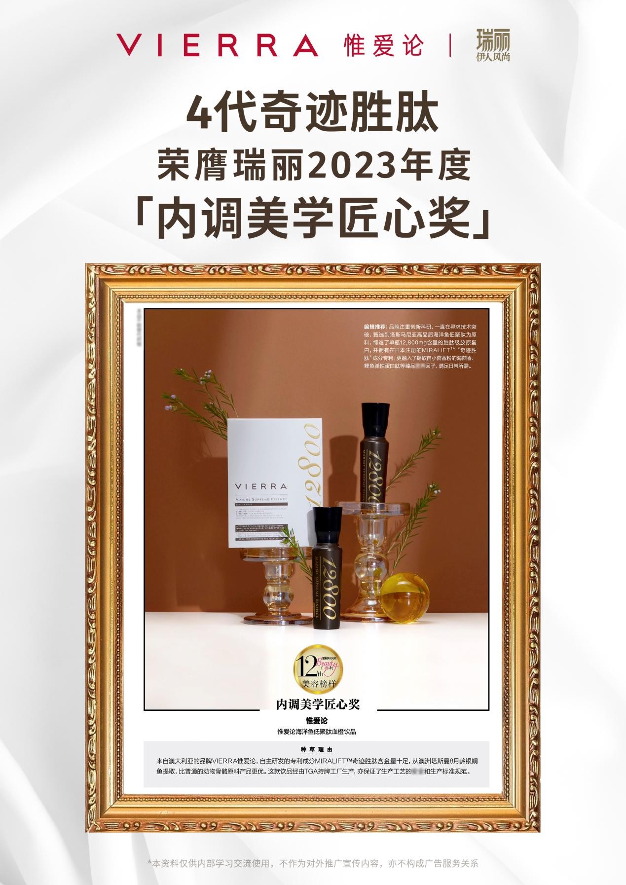 7月10日,国内极具影响力的时尚媒体《瑞丽伊人风尚》发布了2023年度美容榜样获奖名单,其中,来自澳大利亚的口服美容品牌VIERRA惟爱论凭借爆款产品——4代12800mg奇迹胜肽,通过多轮票选与数十位海内外美容专家、资深美容编辑评审,从多个大牌中脱颖而出,夺得「内调美学匠心大奖」,并亮相《瑞丽伊人风尚》杂志7月刊。