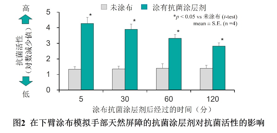 在4名测试者的下臂进行临床试验,按常规手部消毒剂的使用要求(每1 cm2皮肤上涂布3μL),涂布该抗菌涂层剂并研究抗沙雷氏菌效果的持久性。结果显示,涂布手部屏障原型制剂120分钟后,与未涂布时相比,皮肤表面的抗菌活性维持了显著的高水平(图2)。