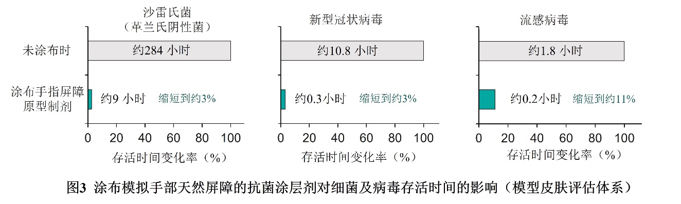 评估结果显示,使用该涂布剂,沙雷氏菌、新型冠状病毒、流感病毒的存活时间均大幅缩短,分别从284小时降为9小时、10.8小时降为0.3小时、1.8小时降为0.2小时(图3)。