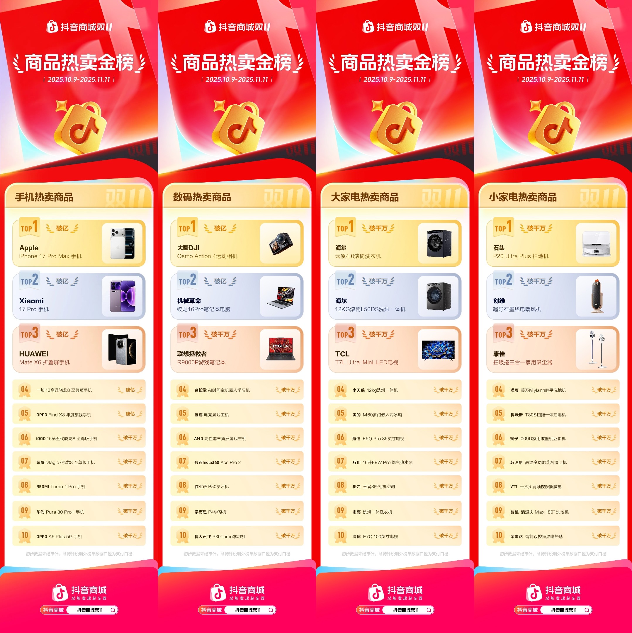 在双11大促中,手机、数码、家电等耐用品类在政策利好与内容转化双重驱动下,迎来新一轮爆发。Apple iPhone 17 Pro Max、Xiaomi 17 Pro 位列手机商品热卖金榜前两席;大疆DJI Osmo Action 4运动相机领跑,位居数码商品热卖金榜榜首;海尔云溪4.0滚筒洗衣机、石头P20 Ultra Plus扫地机分别位居大家电和小家电商品热卖金榜榜首。