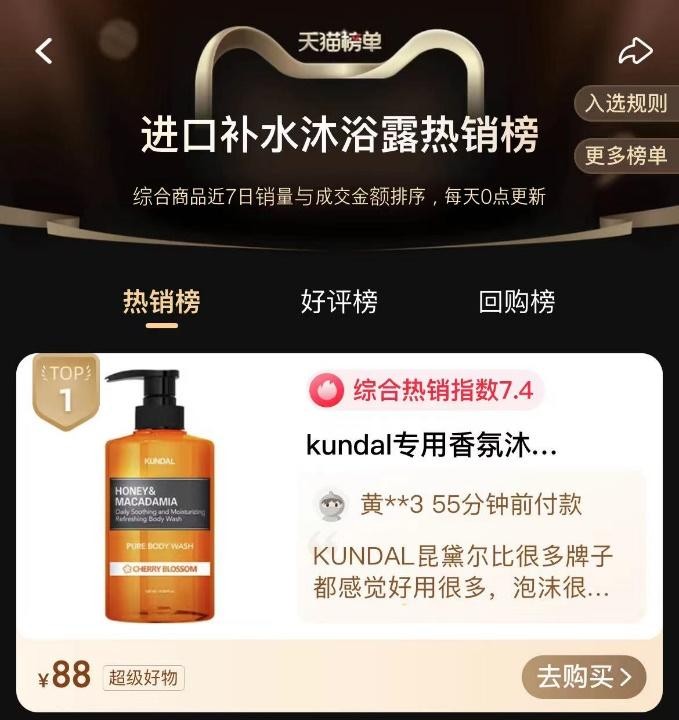 10月14日,在天猫”进口补水沐浴露热销榜”榜单中KUNDAL昆黛尔蜂蜜澳洲坚果沐浴露名列第一位。KUNDAL昆黛尔自2021年在天猫开设海外旗舰店,目前在售洗发水,护发素,沐浴露,身体乳,香薰等60多种产品,其中沐浴露与洗发水品类最受消费者欢迎。