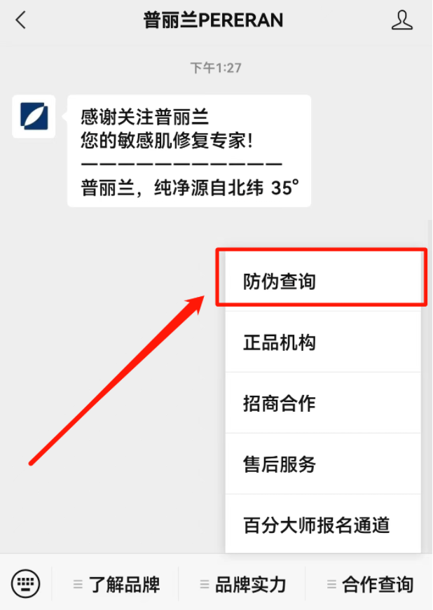 ①搜索并关注“普丽兰PERERAN”公众号