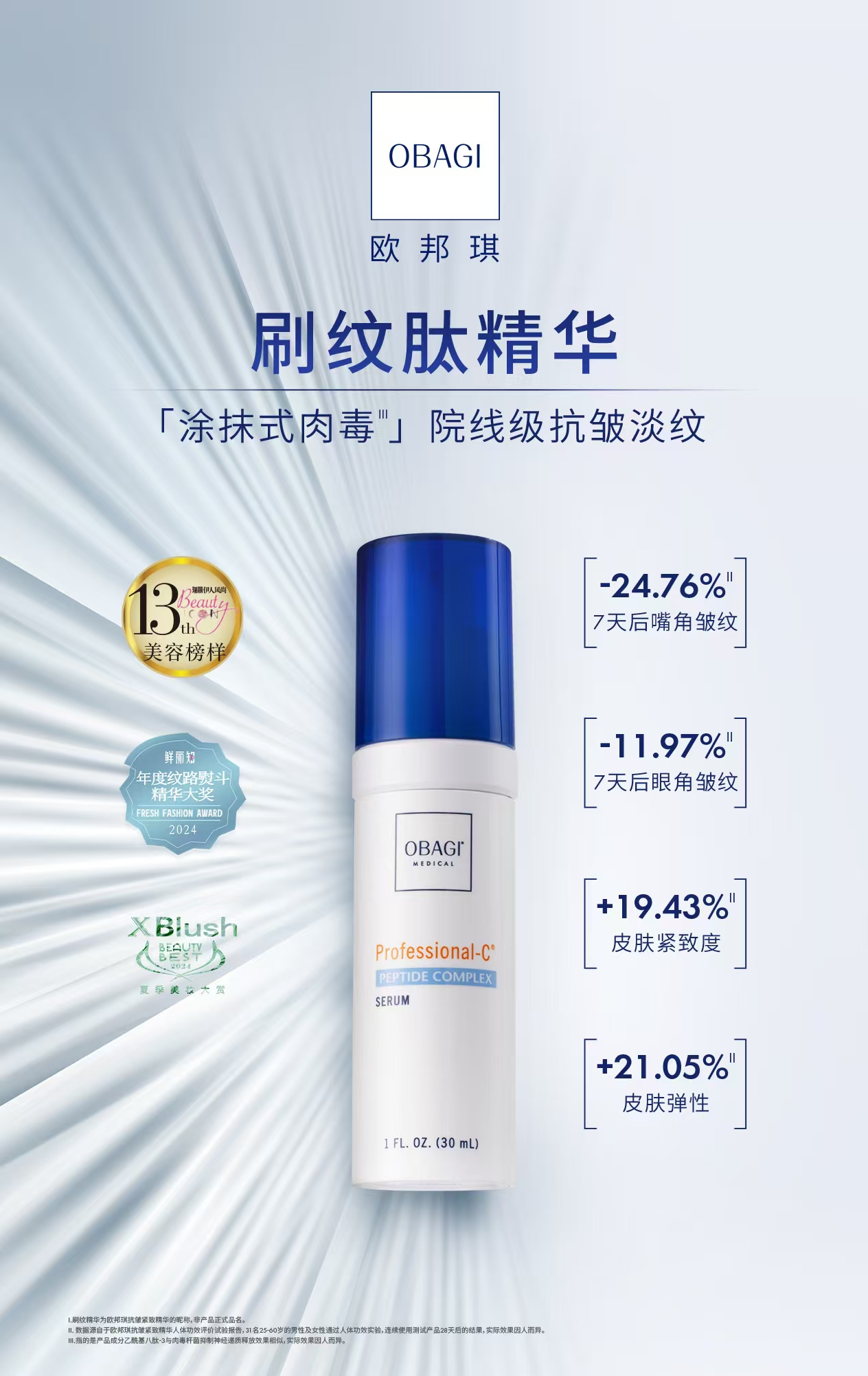 欧邦琪深耕专业护肤领域36年,始终本着“专业主义”的品牌精神,坚持以“实证为本”,以先锋强大的产品矩阵攻克多种肌肤问题。经典王牌产品「蓝瓶VC」,以三重浓度为不同皮肤状态量肤定制分层进阶,实现全维度养护功效。「蓝瓶C10」蕴含10%浓度精纯左式VC,紧致修护,焕现皮肤细腻光泽。「蓝瓶C15」含有15%浓度精纯左式VC,可提拉紧致,增加皮肤水润感及光泽度。「蓝瓶C20」以20%浓度精纯左式VC高能抗皱,强韧皮肤焕活年轻。2024年欧邦琪以「刷纹肽精华」这一先锋力作,为消费者带来了突破性的涂抹式肉毒肽精华, 7天见证皱纹淡化。以抚平纹路、丰盈肌底、抗氧修护三大功效形成黄金三角矩阵,为肌肤带来革新性的淡纹效果。